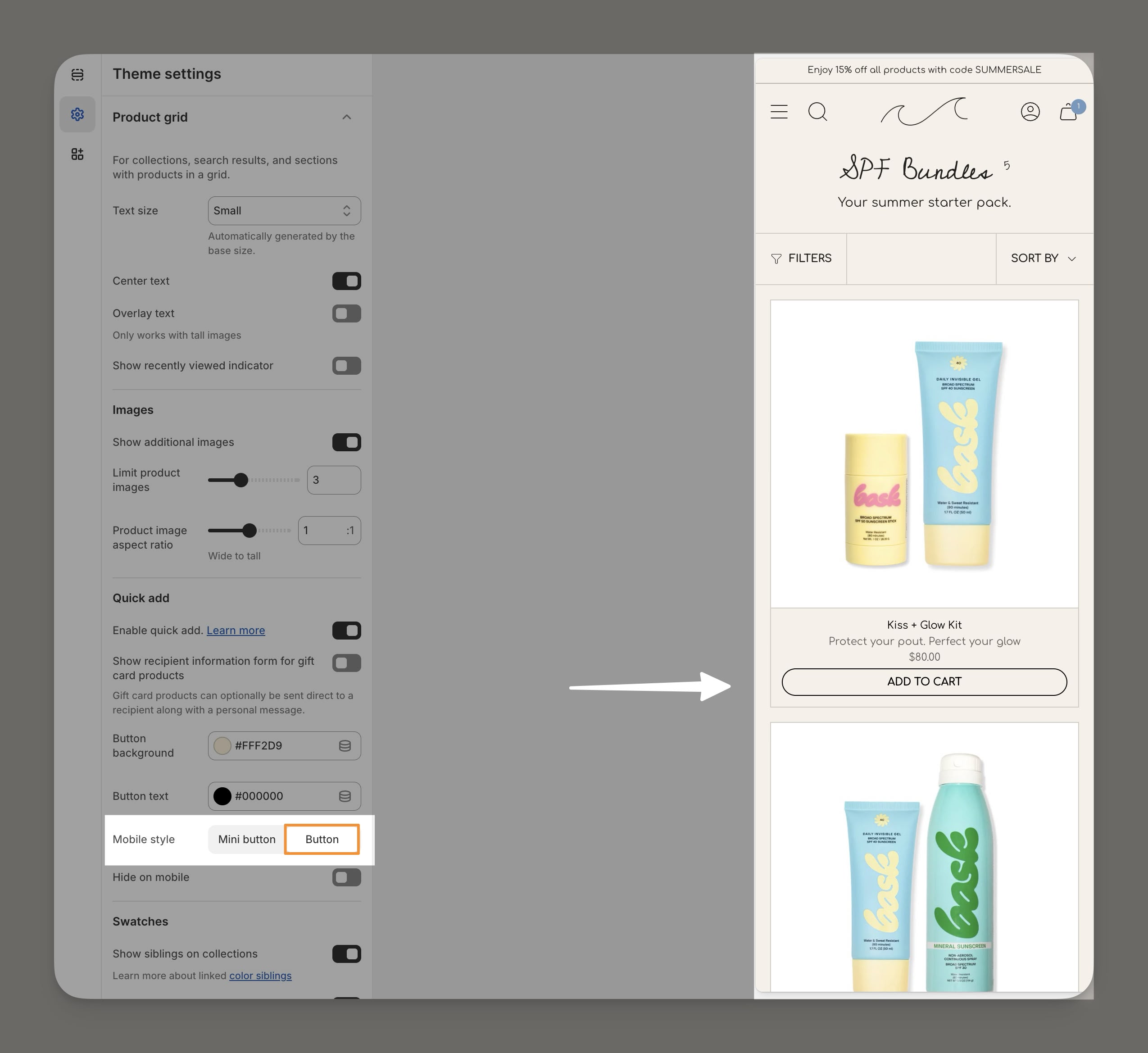 The "Button" option will display a full-sized button in the product card: